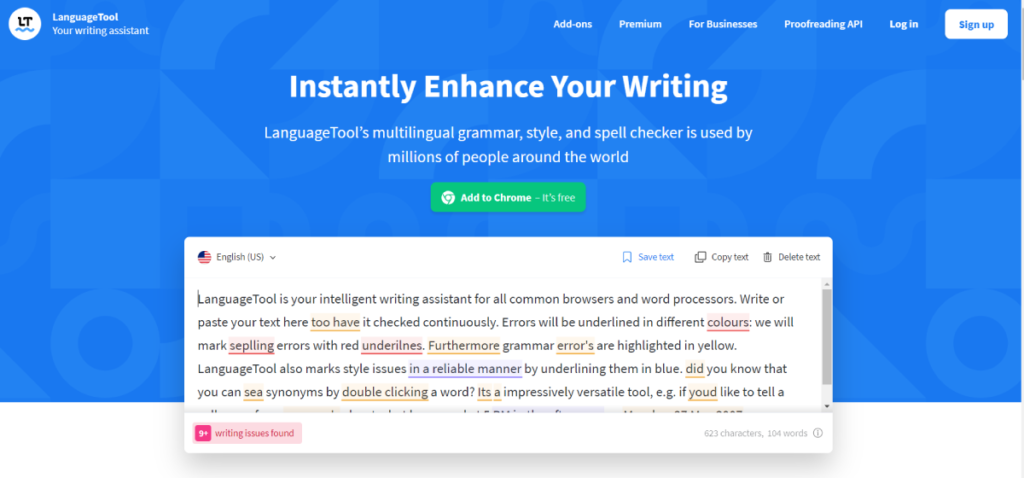 LanguageTool ist sehr benutzerfreundlich und erkennt über 1.700 Fehlermuster. Es findet oft Fehler, die andere Grammatikprüfer übersehen. Dies ist ein leistungsstarkes Tool zur Rechtschreibprüfung, um auch auf Tippfehler und häufig falsch verwendete Wörter zu prüfen. Da es sich um ein Open-Source-Softwareprogramm handelt, hat es eine schöne kostenlose Version seiner Online-Grammatikprüfung. Es beschränkt Sie auf 20.000 Zeichen. Für 19 US-Dollar pro Monat können Sie mit dem Premium-Plan mehr Charaktere erhalten.