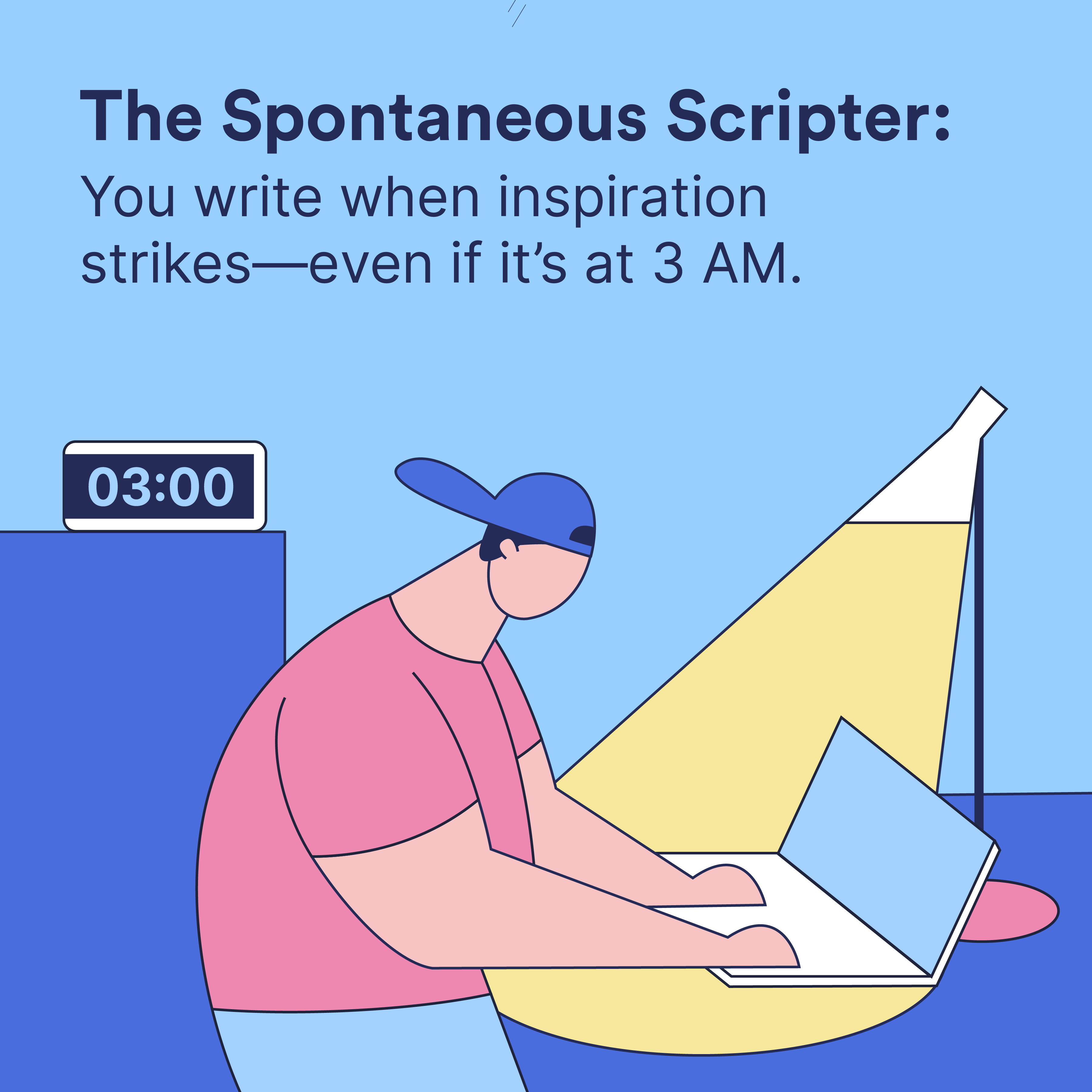 Il loro profilo: The Spontaneous Scripter non conosce programmi che non abbiano infranto. Possono restare seduti davanti al computer per le ore che hanno dedicato alla scrittura, ma svegliarsi per una maratona di scrittura di mezzanotte quando l'ispirazione colpisce.
