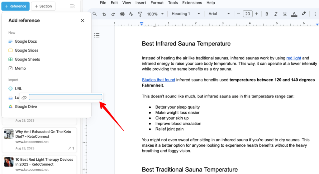そのため、Typed を使い始めたとき、Google ドキュメントをインポートして、すべての記事の横に参照を追加できることを知ってうれしく思いました。 ここからは、1 つのタブ内でリサーチを行って記事を書くことができます。