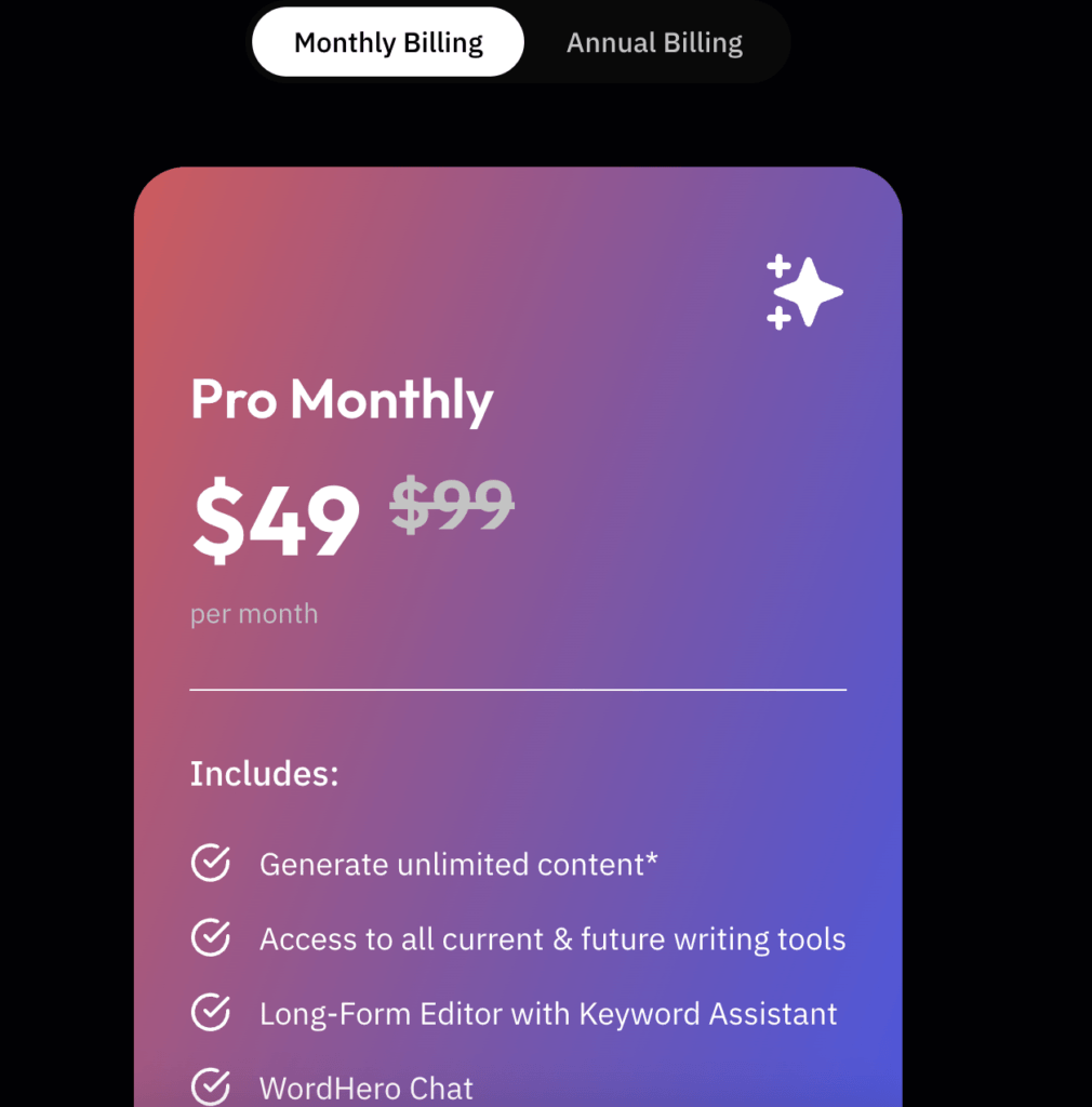 WordHero のすべての料金プランには 14 日間の返金保証が付いています。 そのため、リスクなしでサインアップし、AI 機能の精度をテストし、プラットフォームの感触を得ることができます。 現在、利用可能な価格オプションは次の 2 つです。