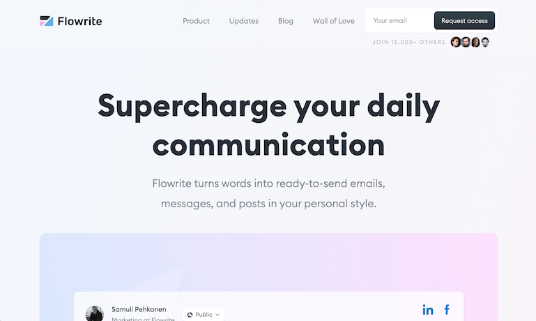 Flowriteは、短い箇条書きをすぐに送信できるメール、メッセージ、投稿に変えるAIライティングツールです。 これは、これまでで最速のライティングエクスペリエンスであり、まったく新しいライティング方法です。数語で指示し、クリックして、テキストがそれ自体を書くのを目撃します。 Flowriteは、作業場所で機能し、日常のタスクや個人的なスタイルに適応します。 AIの最新の進歩に支えられた、最も生産性の高いもののために設計されたこのツールは、効果的なコミュニケーションに仕事を依存している人にとって最高のライティングツールです。