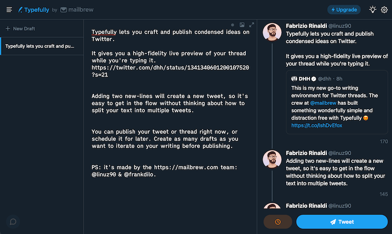 気を散らすことなく素晴らしいツイートを書いて公開することができます。 Mailbrewの背後にあるチームによって作成されたこのツールを使用すると、ツイートスレッドの書き込み中にライブプレビューを表示したり、複数の下書きを保存したり、スケジュールを設定したり、Twitterのモバイルアプリやデスクトップではなく、集中した環境で公開したりできます。