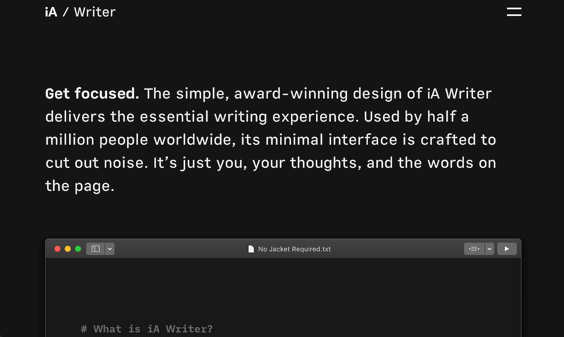 ただ書くことに集中し続けることを唯一の目的として作成されたテキストエディタをご覧ください。 iA Writerは、個別の強力な機能によってサポートされ、上手に書くために必要な、すっきりとした整頓された環境を提供します。 非常にシンプルなので、コンテンツブロックやシンタックスハイライトなどの機能を備えた、内部に詰め込まれた富の力を見落とすのは簡単です。