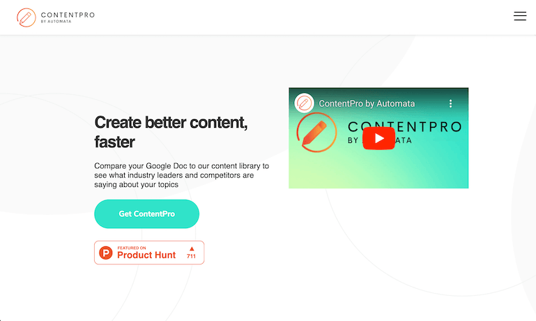 あなたはあなたが書きたいトピックの研究に何時間も費やしていると思いますか? Automataによって作成されたContentProは、同じトピックに関する他社の記事を検索して、執筆を最適化するのに役立ちます。 彼らのChrome拡張機能は、あなたがGoogle Docsに書き始めたものをコンテンツライブラリと比較して、業界のリーダーや競合他社がそれについて何を言っているかを確認します。