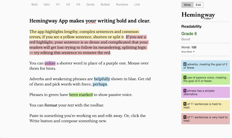 Grammarlyの代替手段をお探しですか? Hemingway Editorは、文章を読みやすくするためのシンプルなツールです。 これは、テキストの品質を低下させる一般的なエラーの特定に重点を置いています。 読みやすさのスコア、ライティングの指標、文のハイライトの3つの主要なカテゴリでフィードバックを提供します。 Hemingway Editorは、過剰な副詞、受動態で書かれた文、読みにくい段落を回避するのに役立ちます。 テキストをコピーしてアプリに貼り付けるだけで、テキストのパフォーマンスが向上する可能性のある視覚的な手がかりと分析とともに、いくつかの数値データを取得できます。
