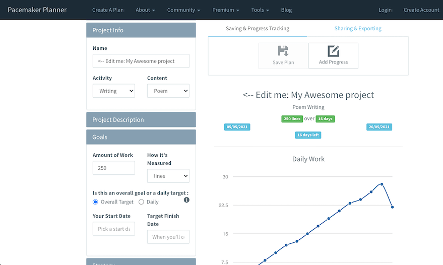 Pacemaker Plannerは、単語数のプランナーおよびトラッカーです。 毎日特定の金額を書きたいのか、特定の曜日に結果を得ることに集中したいのかをアプリに伝えることができます。 あなたはあなたがどのようにやっているかの素晴らしい視覚をあなたに与えるチャートであなたの進歩を見ることができます。 ペースメーカーは、現在の進行状況に基づいて調整することもできます。