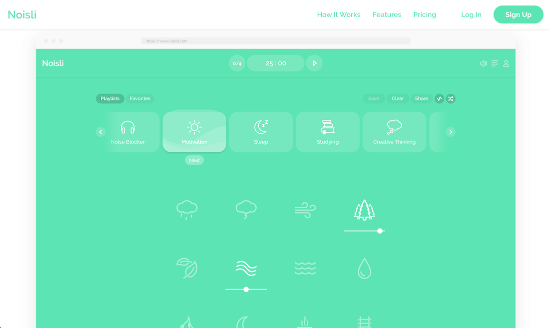 焦点を合わせるためにバックグラウンドノイズが必要な場合は、Noisliが最適です。 Noisliでは、自然や都市をテーマにしたさまざまなサウンドトラックから選択できます。たとえば、雷、水、波、キャンプファイヤー、コーヒーショップ、電車の線路などです。 一度に複数のトラックをミックスして、それぞれの音量を選択できます。 それはあなたにあなた自身のユニークなサウンドトラックを作成する力を与えます。 このアプリには、選択した時間にサウンドトラックを切り取るためのタイマーも組み込まれています。