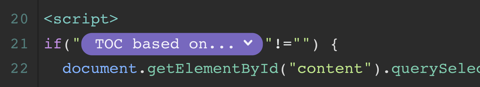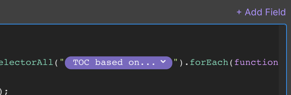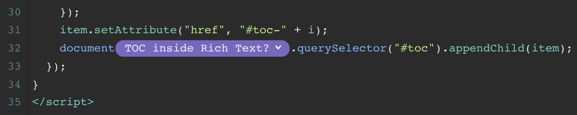 <script> document.getElementById("content").querySelectorAll("[HEADINGS]").forEach(function(heading, i) { // runs a function for all headings inside your rich text element let str = heading.innerHTML; // adds section titles to slugs str = str.replace(/\s+/g, '-').replace(/[°&\/\\#,+()$~%.'":;*?<>{}]/g, "").toLowerCase(); // replaces spaces with hyphens, removes special characters and extra spaces from the headings, and applies lowercase in slugs heading.setAttribute("id", str); // gives each heading a unique id const item = document.createElement("a"); // creates an anchor element called "item" for each heading item.innerHTML = heading.innerHTML; // gives each item the text of the corresponding heading ("[HEADINGS]").split(",").forEach(function(x) { // runs a function for each item in your headings list if (heading.tagName.toLowerCase()==x) { item.classList.add("tocitem", "toc-" + x); // gives each item the correct class } }); item.setAttribute("href", "#" + str); // gives each item the correct anchor link document.querySelector("#toc").appendChild(item); // places each item inside the Table of Contents div }); </script><script> document.getElementById("content").querySelectorAll("[HEADINGS]").forEach(function(heading, i) { // runs a function for all headings inside your rich text element let str = heading.innerHTML; // adds section titles to slugs str = str.replace(/\s+/g, '-').replace(/[°&\/\\#,+()$~%.'":;*?<>{}]/g, "").toLowerCase(); // replaces spaces with hyphens, removes special characters and extra spaces from the headings, and applies lowercase in slugs heading.setAttribute("id", str); // gives each heading a unique id const item = document.createElement("a"); // creates an anchor element called "item" for each heading item.innerHTML = heading.innerHTML; // gives each item the text of the corresponding heading ("[HEADINGS]").split(",").forEach(function(x) { // runs a function for each item in your headings list if (heading.tagName.toLowerCase()==x) { item.classList.add("tocitem", "toc-" + x); // gives each item the correct class } }); item.setAttribute("href", "#" + str); // gives each item the correct anchor link document.querySelector("#toc").appendChild(item); // places each item inside the Table of Contents div }); </script>