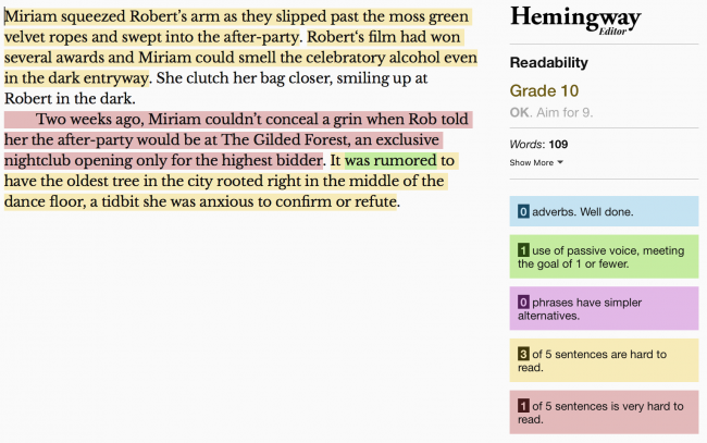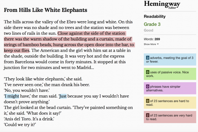 Zauważ, że krótkie wprowadzenie do historii przedstawionej powyżej ma czytelność 10 stopnia. Dlaczego klasa 9 jest lepsza? Pozwól, że zdradzę ci sekret: pisanie, które jest łatwe do odczytania, a jednocześnie przedstawia złożone idee, jest trudne do napisania. Spójrz na ten fragment z „Hills Like White Elephants” samego Hemingwaya.