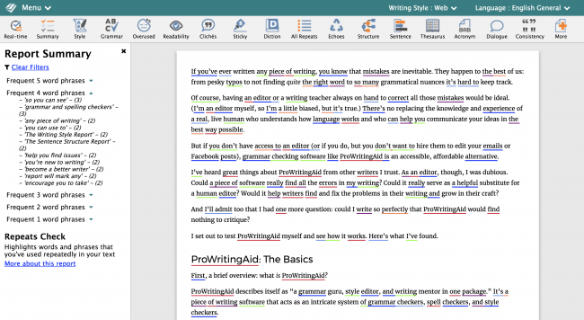 ProWritingAid, tekrar eden kelimeleri yakalamanıza yardımcı olacak bir değil üç rapor içerir.
