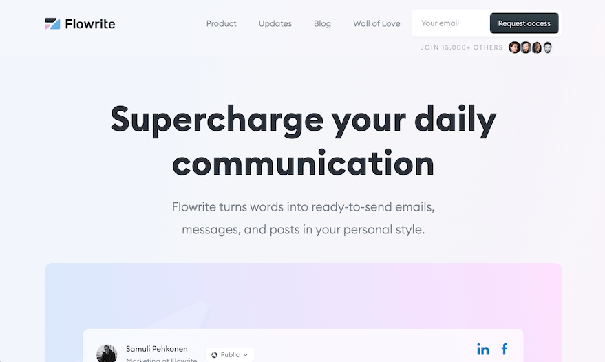 Flowrite 是一种人工智能驱动的写作工具,可将简短的要点转化为可随时发送的电子邮件、消息和帖子。 这是有史以来最快的写作体验,也是一种全新的写作方式:用几句话指导,点击,见证文字的书写。 Flowrite 在您工作的地方工作,适应您的日常任务和个人风格。 它专为最有效率的人而设计,由 AI 的最新进展提供支持,是那些工作依赖于有效沟通的人的写作工具。